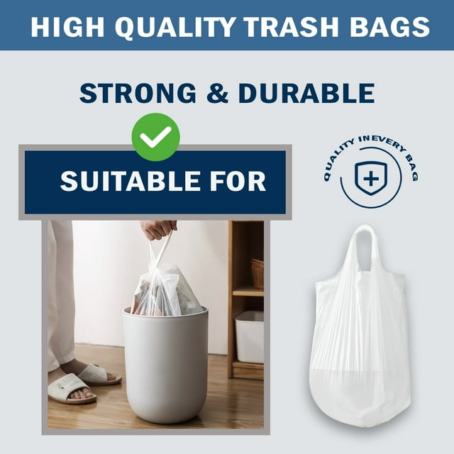 Each 4-gallon trash bag boasts a reinforced bottom, assuring durability even when faced with heavy loads or sharp objects, safeguarding against accidental leaks and preserving the bag’s integrity. Trust our 4-gallon garbage bags to be your reliable partner in maintaining a spotless space.