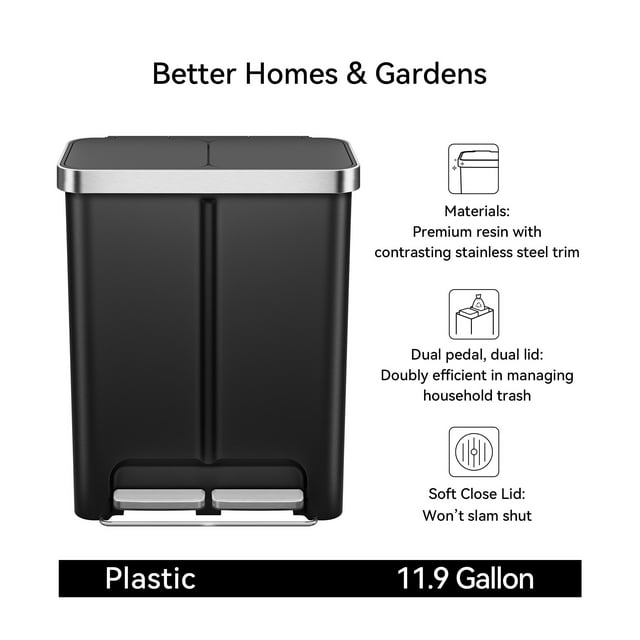 Upgrade your home waste solution with the Better Homes & Gardens Kitchen Recycle Trash Can, 16 Gallon Plastic Dual Compartment Step Garbage Bin, Black. This recycling trashcan features two 8-gallon compartments—perfect for separating trash and recyclables in one space-saving design. The durable black resin body with stainless steel trim complements any kitchen décor, while wide step pedals provide hands-free convenience. A soft-close lid prevents slamming, and the removable inner bucket with handle makes recycling simple. With a bag ring to hold the trash bag in place, a stabilizer bar for balance, and a generous 16-gallon capacity, this dual trash can is built for everyday family use.