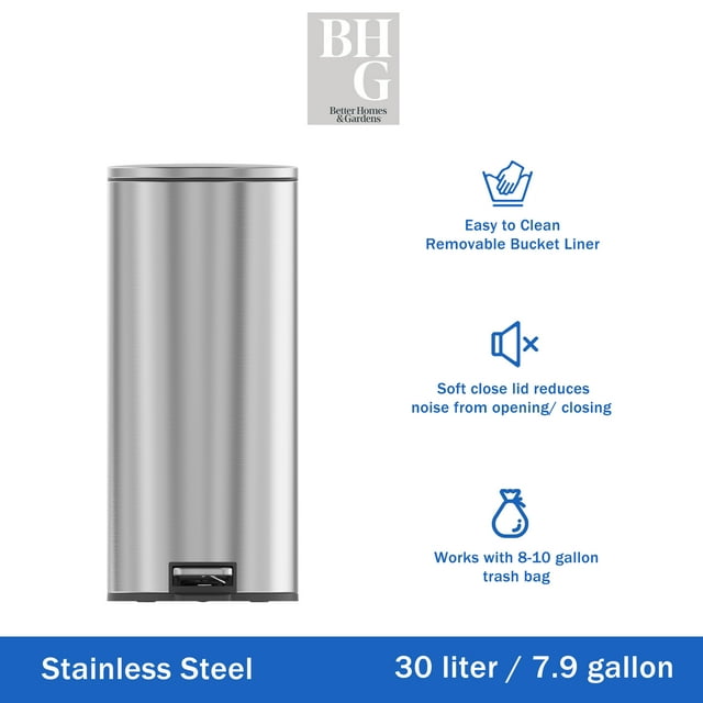 - Better Homes & Gardens Kitchen Trash Can, 7.9 Gallon Stainless Steel Round Step Garbage Bin with Soft Close Lid, Silver