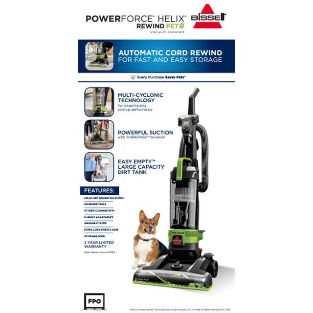 BISSELL PowerForce Helix Turbo Rewind Pet Upright Vacuum features our exclusive Helix™ Performance Dirt Separation System to help keep dirt out of the filters for longer-lasting pickup performance. It also features an extra-wide cleaning path to remove embedded dirt and hair in less time. PowerForce® Turbo Rewind Pet vacuum is lightweight and easy to maneuver, so you can carry it up and down the stairs and vacuum under furniture. Maintaining the machine is easy with the large-capacity Easy Empty™ Dirt Tank that empties dirt and debris with the push of a button. The automatic cord rewind also wraps the cord for you, so getting your machine ready for storage is a breeze. When you buy a BISSELL product, you help save pets, too. We’re proud to design products that help make pet messes, odors, and pet homelessness disappear.