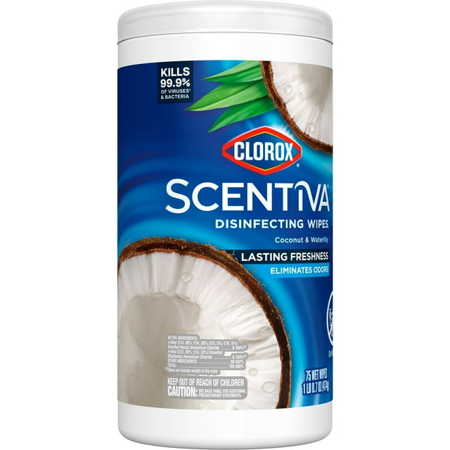 Clean and disinfect your home while enjoying the captivating, long lasting scent of Coconut and Waterlily with these bleach free, all in one cleaning wipes. Clorox Scentiva Disinfecting Wipes kill 99.9% of viruses and bacteria, including the COVID 19 (1) Virus, in 15 seconds when used as directed on hard nonporous surfaces. These multi surface wipes leave long lasting freshness and use a clear drying formula that powers through grease, soap scum and grime, so you can tackle any surface with confidence. Clorox Scentiva Disinfecting Wipes even eliminate odors and prevent bacteria growth (2) for up to 24 hours. Germs and messes occur on more than kitchen counters and bathroom surfaces. Safely wipe down garbage cans, sinks, toys, remotes and appliances, or clean up car spills with these non bleach sanitizing wipes. Do not flush. (1) Kills SARS CoV 2 on hard nonporous surfaces. Use as directed for other germs. (2) Prevents growth of odor causing bacteria on non food contact surfaces.
