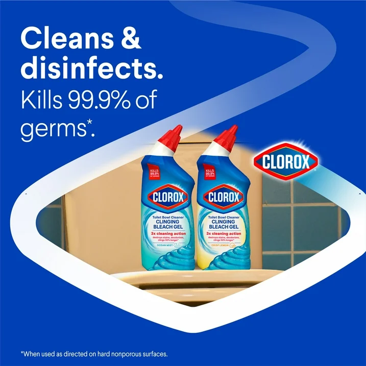 Trust the thick clinging gel formula of Clorox Toilet Bowl Cleaner Clinging Bleach Gel for a sparkling clean. This Clorox toilet cleaner delivers 3X cleaning action. It destroys stains, deodorizes, and clings 50% longer (1). It also kills 99.9% of germs (2) and clears toilet bowl odors from your bathroom with an Ocean Mist scent. The wide dispensing bottle and clinging gel formula coats the bowl and rinses away unsightly pink toilet rings as well as mold and mildew stains. Use this Clorox toilet bowl clinging gel to whiten and brighten your bowl and leave it refreshed for the next go. (1) Vs. Clorox Toilet Bowl Cleaner with Bleach, Rain Clean. (2) When used as directed on hard nonporous surfaces.