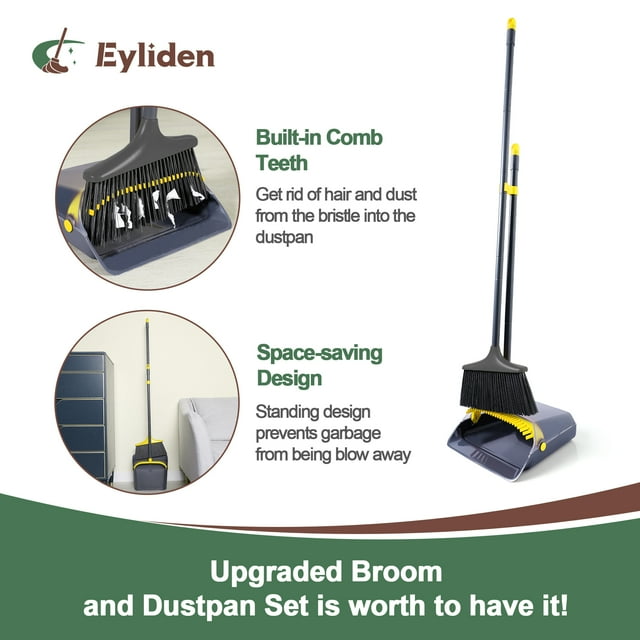 - The Eyliden Broom with Dustpan Combo Set features a unique stand-up dustpan design for stability, vertical storage, and stand-up storage, allowing for compact and tidy storage when not in use.