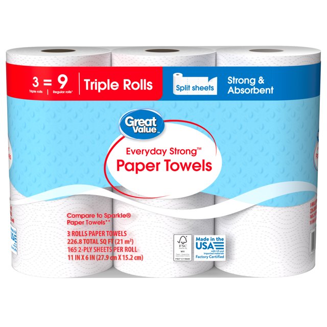 Great Value Everyday Strong Paper Towels, Split Sheets, 3 Triple Rolls, Comparable to Sparkle