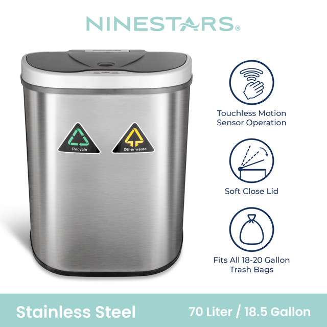 Nine Stars Dual Compartment Automatic Trash Can, 18 Gallon Stainless Steel, Motion Sensor Hands-Free Soft-Close Lid Garbage Recycle Bin, Silver