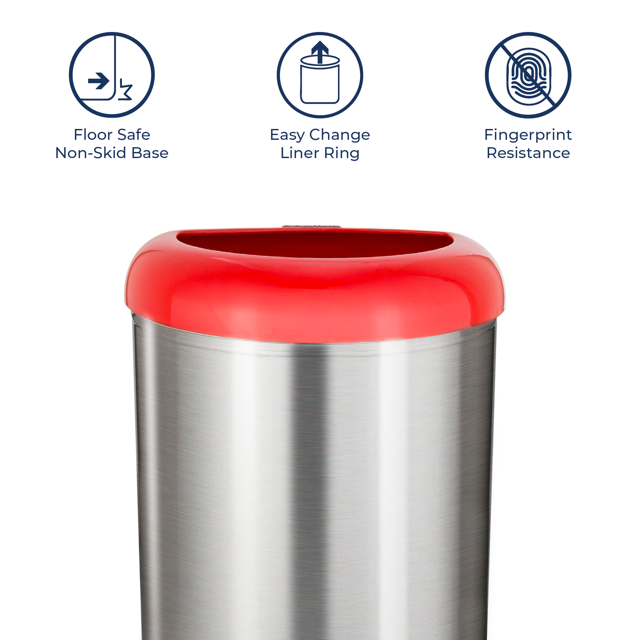 Nine Stars Open-Top Kitchen Trash Can, 13 Gallon Stainless Steel, Hands-Free Waste Bin, Silver and Red