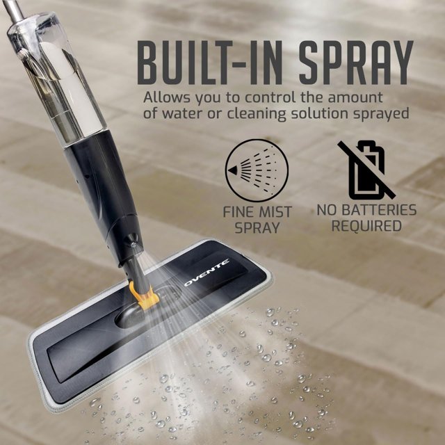 Experience the ultimate cleaning convenience with the OVENTE Microfiber Spray Mop CTM121BGD. A game-changer in effortless and efficient floor cleaning which delivers a better result — not only because it saves cleaning time when compared to the leading spray mop. The built-in spray function releases a fine mist of liquid or cleaning fluid, allowing the super-absorbent microfiber pad to effortlessly lift and trap dirt, dust, hair, dander, grime, etc. Say goodbye to messy buckets and heavy mop wringing! This upgraded sprayer mop with 360 degree spinning head can easily be maneuvered into all corners and hard-to-reach areas leaving your floors sparkling clean. It allows you to remove dust under your sofa, bed, around table legs, or any other tight spot and works well on many surfaces, even the most stubborn marks/dirt can be dealt with quickly and easily. Thanks to the innovative design and superior cleaning performance which makes it a must-have item for every house, apartment or dorm. Simply press the trigger on the handle to release misty water, you’ll literally clean your entire lounge and kitchen in less than ten minutes — more than half the time it usually takes. You can add your favorite cleaning solution according to different cleaning needs, but please do not pour strong acid or boiling water into the bottle because it will hurt your floor. When switching between cleaners or preparing for storage, fill the bottle with clean water and spray 5 times, then discard remaining water once done and store empty. Level-up your cleaning routine and enjoy the efficiency and effectiveness without needing a battery with the OVENTE Microfiber Spray Mop today!