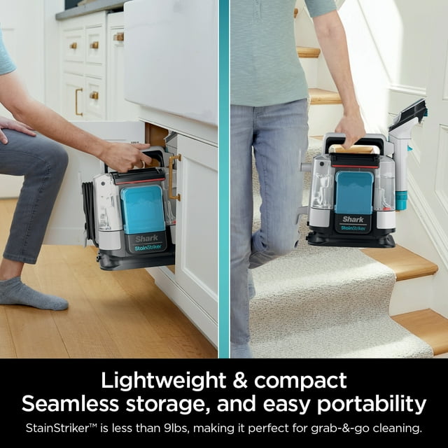 The Shark® StainStriker™ is a portable spot & stain eliminator that delivers powerful tough stain elimination, with no premix required. Dual-activated solution unleashes the power of OXY delivering 20X more stain-striking power*. Tackle food stains, spills, embedded dirt, & pet messes throughout your home: carpets, area rugs, couches, upholstery & more.