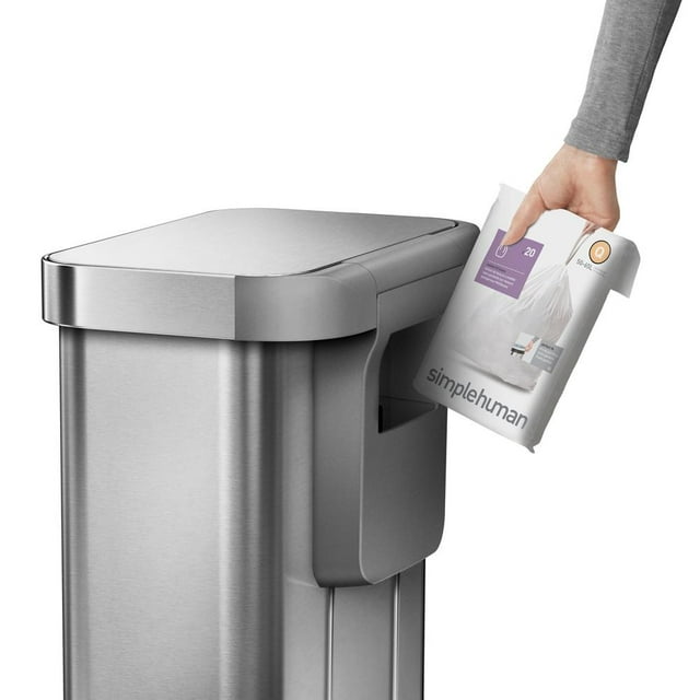 The simplehuman 55 Liter / 14.5 Gallon stainless steel rectangular step kitchen trash can features an innovative ‘liner pocket’ that stores and dispenses liners from inside the can for a faster liner change. The stainless steel liner rim grips the liner and keeps it hidden. And with no inner bucket, there’s more space for trash. Strong wide steel pedal is designed to last, and our patented lid shox technology ensures a smooth, silent close every time. Includes an all natural odorsorb pod that fits discreetly under the trash can lid to eliminate trash odors for 45 days.