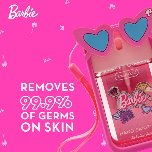 Meet the Smart Care Barbie Hand Sanitizer Spray featuring a silicone case shaped like Barbie’s iconic sunglasses. This Barbie hand sanitizer features a fruity, watermelon scent inspired by summer! This compact 1.35-ounce spray is perfect for staying germ-free wherever you are. Whether for your purse, travel bag, or keeping it handy in your car, it’s the travel bag essential you’ve been looking for. A convenient silicone case protects the hand sanitizer from dings and scratches and the convenient wrist strap can be used on your hand or bag to safely secure your sanitizer. The easy-to-use spray nozzle ensures a non-sticky, even application with every spritz, killing 99% of germs in seconds while hydrating your skin with aloe vera. Available in a variety of colors and scents to suit your style so you can accessorize wherever you go, just like Barbie! Stay safe, stay stylish, and make the Smart Care Hand Sanitizer Spray your trusted companion for cleanliness on the go.